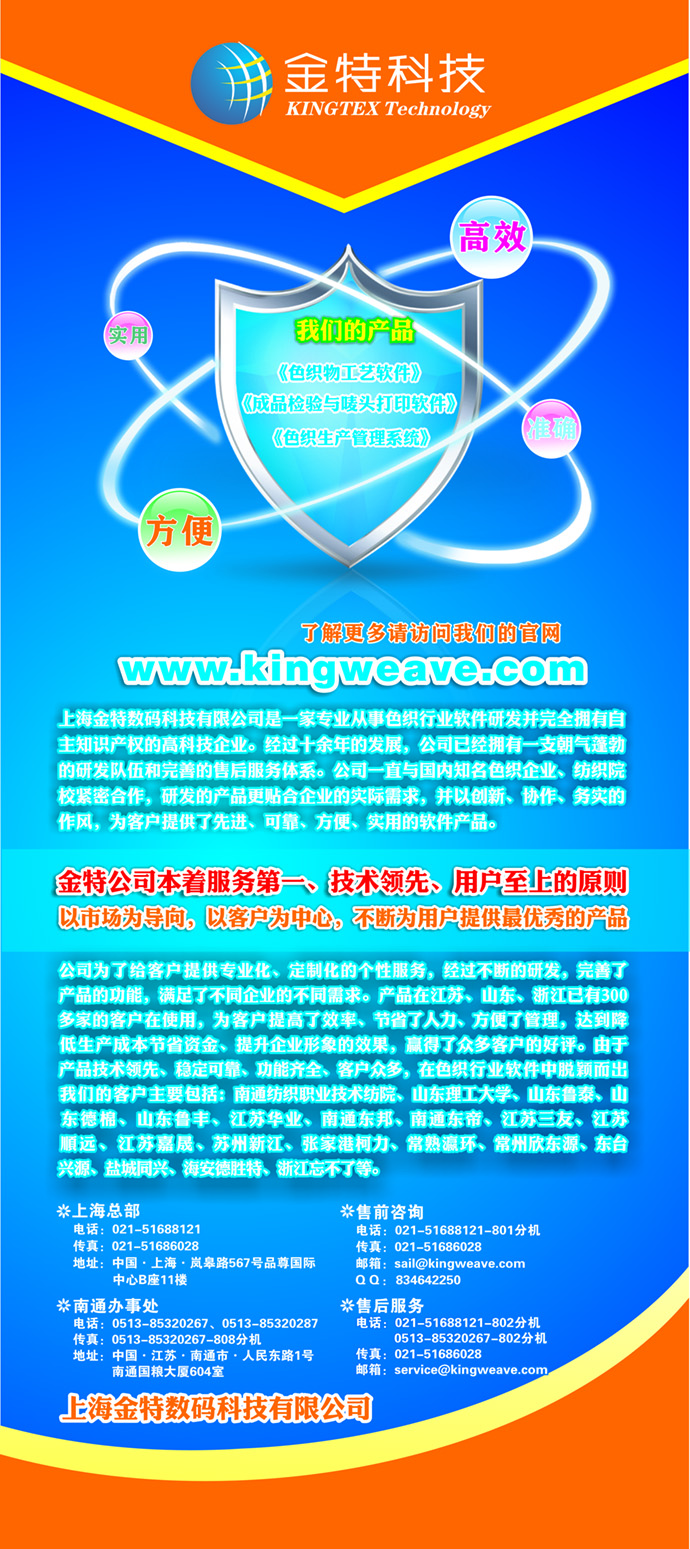 上海金特數(shù)碼科技有限公司是一家專業(yè)從事色織行業(yè)軟件研發(fā)并完全擁有自主知識產(chǎn)權(quán)的高科技企業(yè)。經(jīng)過十余年的發(fā)展,公司已經(jīng)擁有一支朝氣蓬勃的研發(fā)隊伍和完善的售后服務(wù)體系。公司一直與國內(nèi)知名色織企業(yè)、紡織院校緊密合作,研發(fā)的產(chǎn)品更貼合企業(yè)的實際需求,并以創(chuàng)新、協(xié)作、務(wù)實的作風(fēng),為客戶提供了先進、可靠、方便、實用的軟件產(chǎn)品。我們的產(chǎn)品有:《色織物工藝軟件》、《成品檢驗與嘜頭打印軟件》、《色織生產(chǎn)管理系統(tǒng)》。