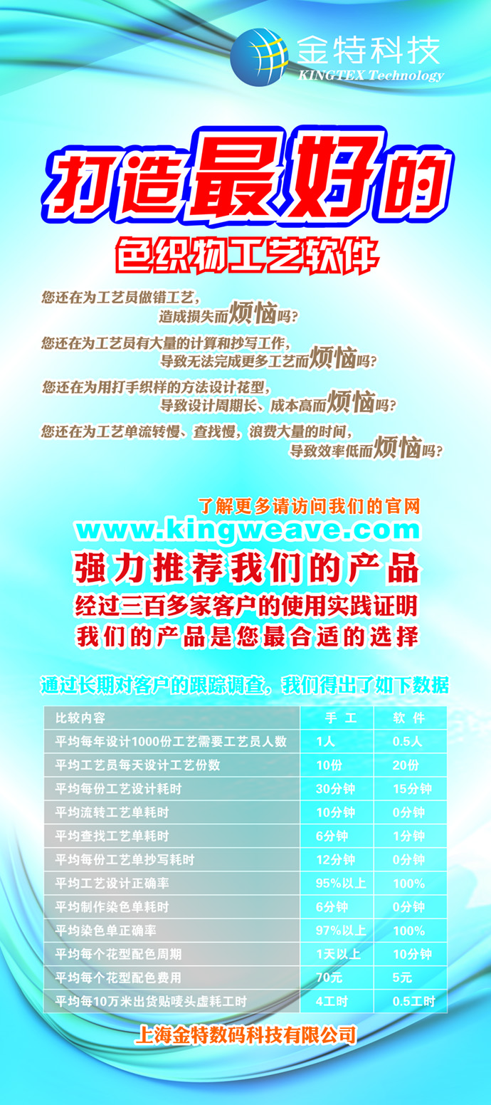 在這種情況下,使用我們的軟件,只需在軟件中輸入必要的參數(shù),所有的計算都由電腦來完成,所有的報表都由電腦生成,并通過打印機打印出來,而且在電腦上可看到織物的模擬效果,可用布樣進行比對,無需等到機頭布下來,就可知道工藝設(shè)計是否正確。